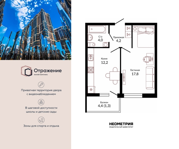 Продается квартира в жилом комплексе «Отражение». Это новый стандарт комфортного проживания от федерального девелопера «Неометрия».