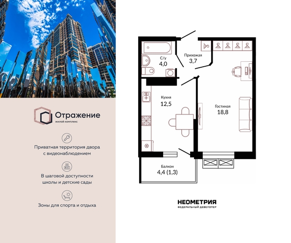 Продается квартира в жилом комплексе «Отражение». Это новый стандарт комфортного проживания от федерального девелопера «Неометрия».