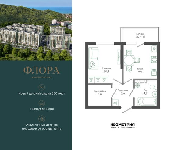 Продается квартира в ЖК «Флора» от федерального девелопера «Неометрия». Это жилой комплекс комфорт-класса в самом зеленом районе Сочи. При проектировании постарались максимально сохранить окружающую флору и фауну. Теплое море, горы, целебные источники, река, близость заповедника – все это уже рядом с вами.