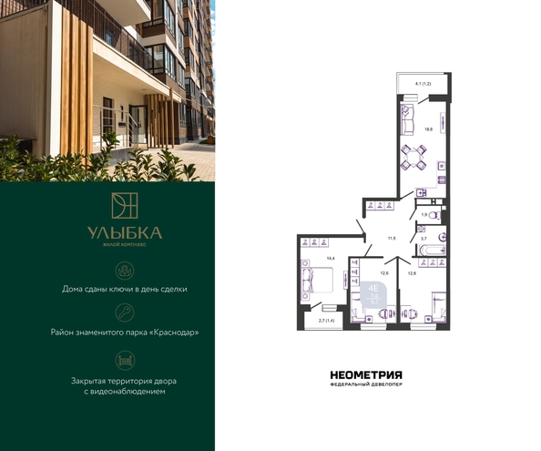 Продается квартира в жилом комплексе «Улыбка» от федерального девелопера «Неометрия». Все дома сданы, ключи в день сделки.
