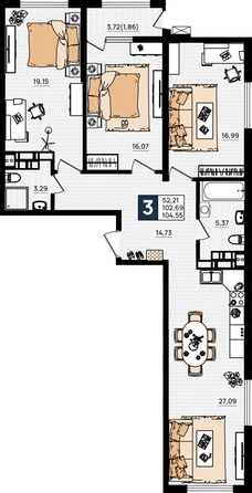 Общая площадь квартиры — 104.55 кв.м. Тип дома — монолит-кирпич. Компания-застройщик — ССК.