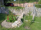На участке произведены ландшафтные работы с применением габионов, тротуарных покрытий и других архитектурных элементов.