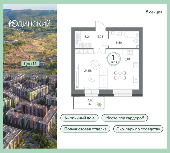 1-комнатная квартира, 43.46кв.м., 6 этаж