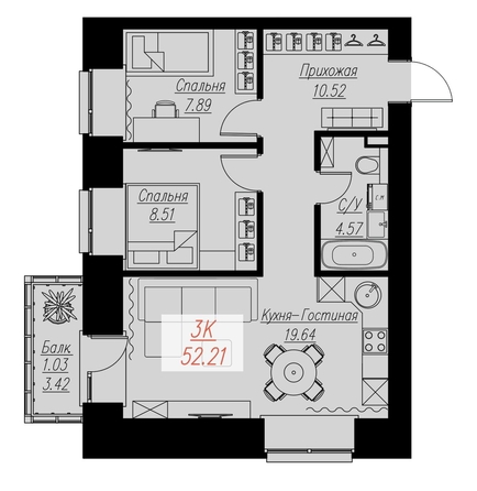 Смарт-планировка в самом лучшем исполнении! На 52,21 м2 поместились большая квадратная прихожая 10,52 м2 под большой встроенный шкаф и пуф с зеркалом, две (!) раздельные спальни с местом под шкаф или возможностью разместить рабочее место, кухня-гостиная 19,64 м2 с двумя окнами и выходом на балкон. Настоящая мечта! Номер объявления SD24-3962823.