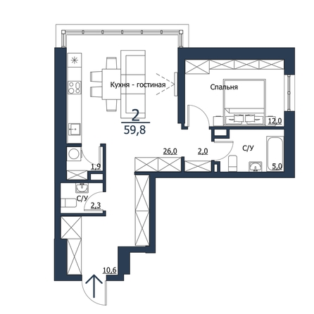 Благодаря оригинальному размещению спальни и санузла вы можете полностью отгородить их дверью (в этом случае гости смогут пользоваться дополнительным санузлом в прихожей). Либо же оставить все как есть, а небольшой коридор использовать как место для хранения.