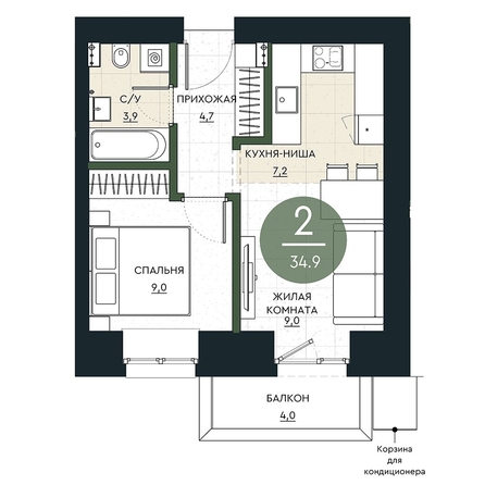 Топовая smart-планировка от АРБАН. На площади менее 35 м2 представлен функционал полноценной двухкомнатной квартиры. Здесь есть компактная спальня, гостиная с французским окном в пол, кухня-ниша и две ниши под встроенные системы хранения. А также дополнительное пространство в виде балкона с витражным остеклением.