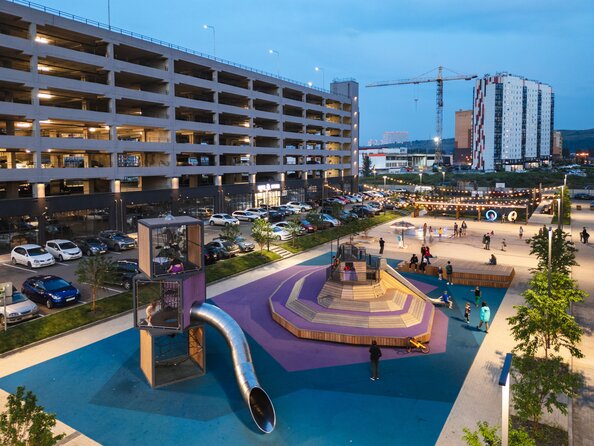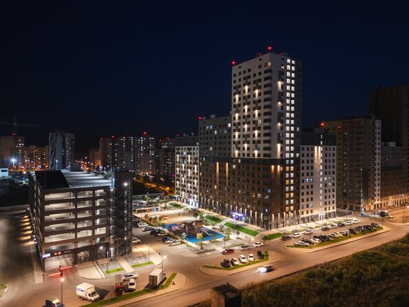 Для машин за периметром квартала устроены наземные парковки и многоуровневый паркинг.