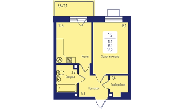 Общая площадь квартиры — 36,2 кв.м., жилая-13,1 кв.м., кухня-10,4 кв.м.