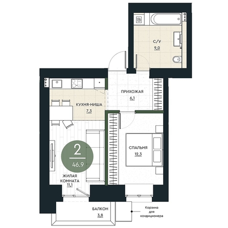 А также в квартире полноценная 12-метровая спальня с нишей под встраиваемый шкаф. Украшение кухни-гостиной — французские окна в пол и балкон с витражным остеклением.