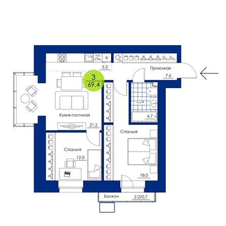 Эта компактная 3-комнатная квартира отличается продуманной планировкой. Две уютные спальни обращены окнами в сторону «Вита-Парка», а значит, вы сможете засыпать и просыпаться под шум многолетних деревьев, как будто живете в загородном доме в лесу. В одной из спален есть собственный французский балкон. Удобная кухня-гостиная создана для того, чтобы проводить время вместе или принимать гостей. Ее украшение – видовой витражный эркер. В квартире предусмотрено много мест для хранения и вместительный удобный санузел.