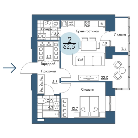 Эта квартира — зеркальный близнец самой популярной двухкомнатной планировки в проектах АРБАН, только просторнее на 3 м². Идеальное сочетание площади и функционала: тут есть и гардеробная в прихожей, и лондри в виде отдельного помещения, изолированная спальня и витражный эркер в зоне гостиной.