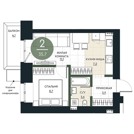 Топовая smart-планировка от АРБАН. Компактная 2-комнатная квартира с богатым функционалом. На площади всего 35,7 м2 расположились спальня, зоны кухни, столовой, гостиной с французским окном в пол, прихожая правильной квадратной формы и вместительный санузел. В планировке выделено три ниши для установки встраиваемых шкафов, а также дополнительное пространство в виде балкона с витражным остеклением.