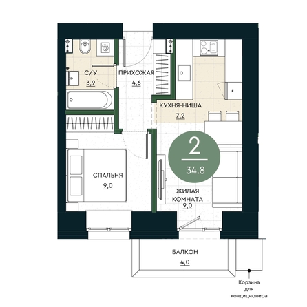 Топовая smart-планировка от АРБАН. На площади менее 35 м2 представлен функционал полноценной двухкомнатной квартиры. Здесь есть компактная спальня, гостиная с французским окном в пол, кухня-ниша и две ниши под встроенные системы хранения. А также дополнительное пространство в виде балкона с витражным остеклением.