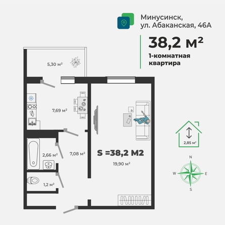 1-комнатная квартира 38,2 м² в сданном доме на 8 этаже.