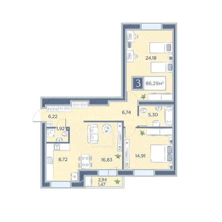 3-комнатная квартира, 86.29кв.м., 4 этаж