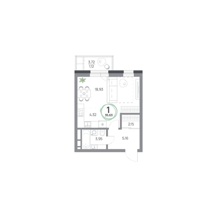 1-комнатная квартира, 35.63кв.м., 3 этаж