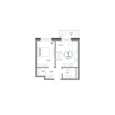 1-комнатная квартира, 41.99кв.м., 2 этаж