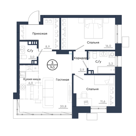 Хит-продаж и самая просторная планировка в доме. Полноценная 3-комнатная квартира, где есть все для комфортного проживания семьей: раздельные спальни, два санузла, один из которых с окном, и просторная кухня-гостиная для общих сборов. Ее украшение – угловое панорамное окно. Из него открываются виды на приватный двор и общественное пространство «Гнездо» в центре микрорайона. В квартире много места для хранения в прихожей и спальнях.