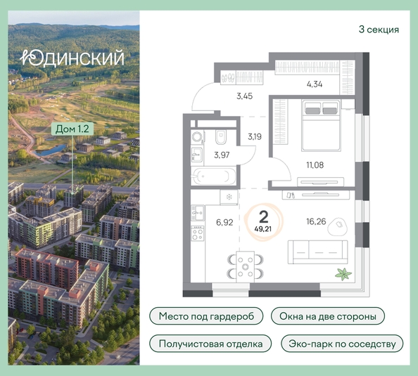 2-комнатная квартира, 49.21кв.м., 1 этаж
