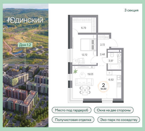2-комнатная квартира, 54.63кв.м., 1 этаж