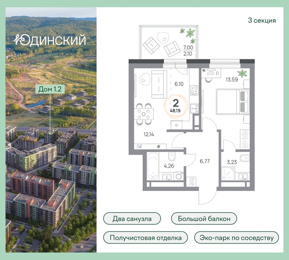 2-комнатная квартира, 48.19кв.м., 2 этаж