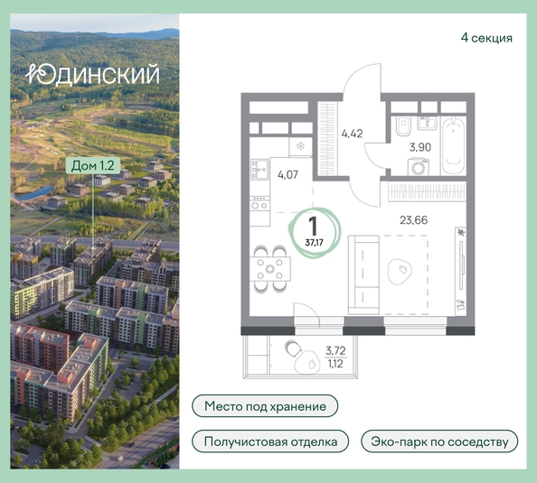 1-комнатная квартира, 37.17кв.м., 2 этаж