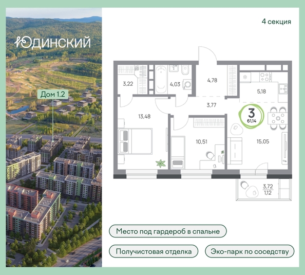3-комнатная квартира, 61.14кв.м., 9 этаж