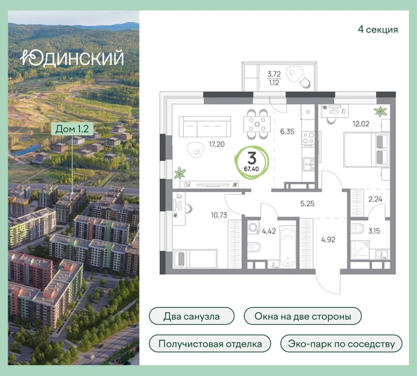 3-комнатная квартира, 67.27кв.м., 9 этаж