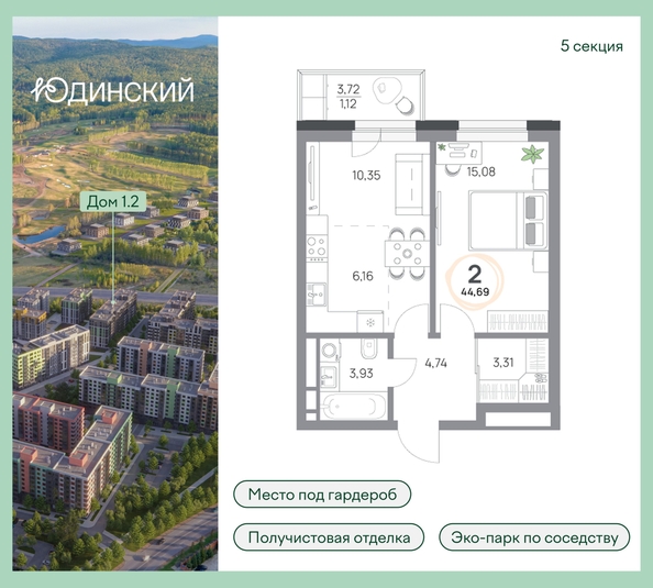 2-комнатная квартира, 44.69кв.м., 2 этаж