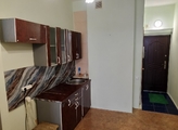 Есть кухонный гарнитур, стол, кухонный уголок, шкаф, небольшой диванчик, стиральная машинка и холодильник.