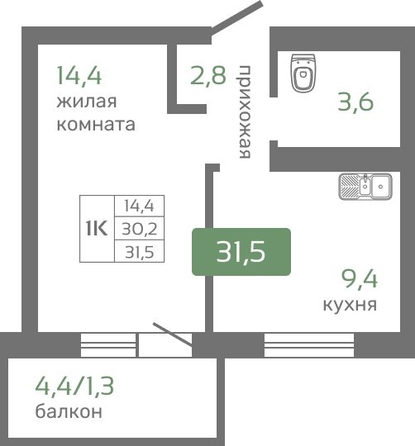 Общая площадь квартиры — 31.5 кв.м. Тип дома — монолит-кирпич. Компания-застройщик — ГК СТМ.