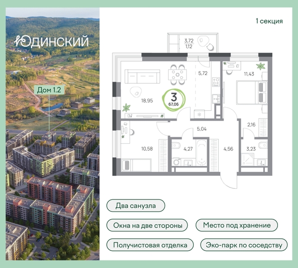 3-комнатная квартира, 67.06кв.м., 7 этаж
