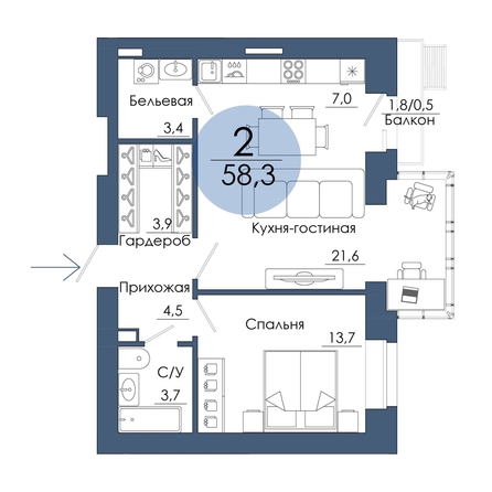 Эта планировка давно одна из самых любимых у наших покупателей. В ней идеально все: просторная светлая кухня-гостиная, гардеробная в прихожей и лондри в виде отдельного помещения. Уютная спальня надежно скрыта от глаз гостей.