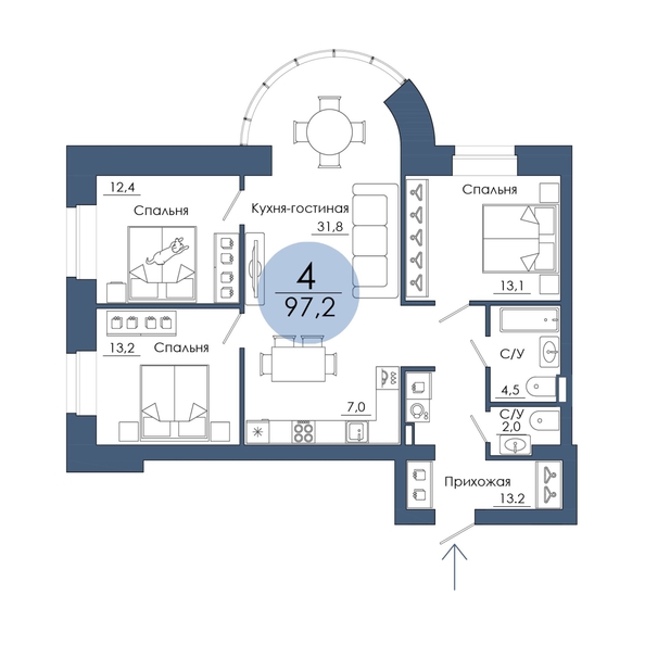 Уникальная и максимально функциональная квартира, так полюбившаяся покупателям. В ней три изолированные спальни и просторная кухня-гостиная, объединяющая всех членов семьи, с полукруглым витражным эркером. В прихожей — вместительная гардеробная и лондри-ниша.