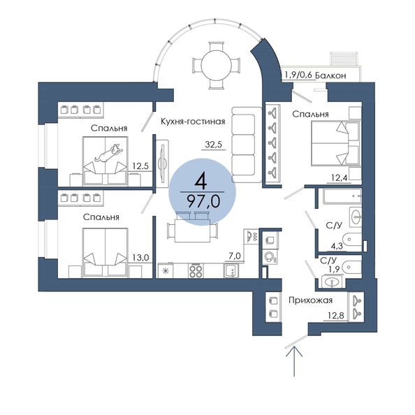 Уникальная и максимально функциональная квартира, так полюбившаяся нашим покупателям. В ней три изолированные спальни, одна из которых с французским балконом, и просторная кухня-гостиная, объединяющая всех членов семьи, с полукруглым витражным эркером. Из окон некоторых квартир открываются прекрасные виды на Енисей.