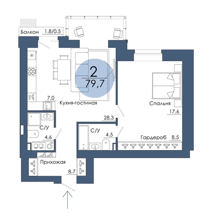 Эксклюзивная планировка для тех, кто предпочитает большой метраж. Самая просторная мастер-спальня в проекте с собственной ванной комнатой и 8,5-метровым гардеробом. Кухня-гостиная тоже просторная, в ней есть витражный эркер и выход на открытый французский балкон.