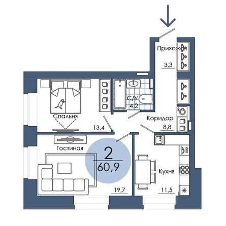 Классическая планировка с отдельной 11-метровой кухней. Уютная спальня с местом для шкафа. Окна гостиной выходят на 2 стороны, наполняя пространство светом. В просторной прихожей расположены ниши для встроенных шкафов и лондри.