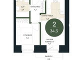 Топовая smart-планировка от АРБАН. На площади менее 35 м2 представлен функционал полноценной двухкомнатной квартиры. Здесь есть компактная спальня, гостиная с французским окном в пол, кухня-ниша и две ниши под встроенные системы хранения.