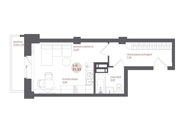 Общая площадь квартиры — 31.23 кв.м. Тип дома — монолит-кирпич. Компания-застройщик — ДСК.
