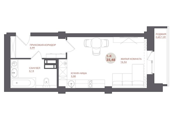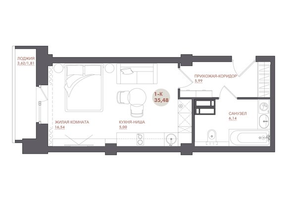 Общая площадь квартиры — 35.48 кв.м. Тип дома — монолит-кирпич. Компания-застройщик — ДСК.