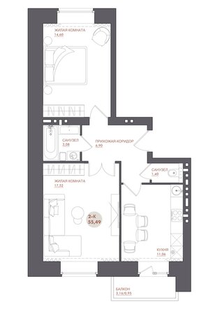 Общая площадь квартиры — 55.49 кв.м. Тип дома — монолит-кирпич. Компания-застройщик — ДСК.