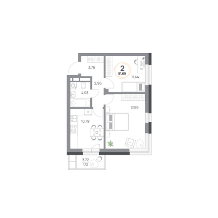 2-комнатная квартира, 51.66кв.м., 3 этаж