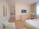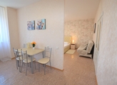 В квартире есть все для комфортного проживания. Комната: кровать, диван, телевизор, шкаф, журнальный столик. Кухня: обеденный стол, стулья, кухонный гарнитур, электроплита, холодильник, микроволновая печь, электрочайник, посуда и кухонные принадлежности. Санузел: ванна, стиральная машина.