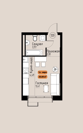 Общая площадь квартиры — 20.68 кв.м. Тип дома — монолитный. Компания-застройщик — Сказочный город.