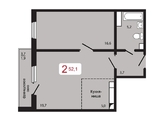 Общая площадь квартиры — 52,2 кв.м., кухня-гостиная - 24,7 кв.м., жилая-17 кв.м.