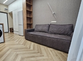 Зона отдыха оснащена удобным раскладным диваном в стиле «лофт». В квартире предусмотрен многофункциональный встроенный шкаф.