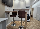 Пространство квартиры полностью обустроено новой современной мебелью и бытовой техникой (большой ТВ, духовой шкаф, микроволновка, стиральная машинка с функцией сушки белья, вар. панель, эл.чайник, холодильник, кондиционер).